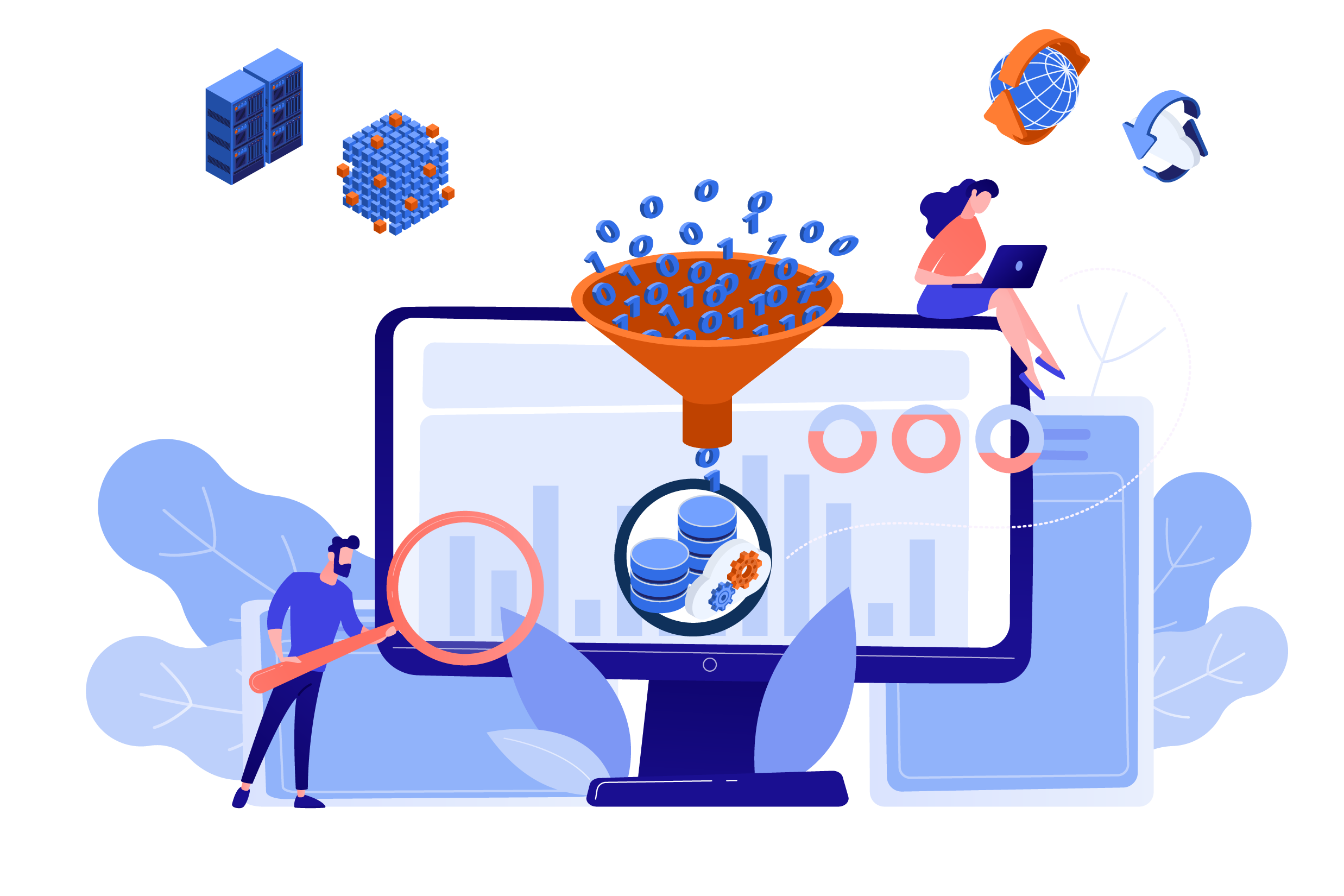 Te ayudaremos a administrar tus datos en el proceso de ingerir, almacenar, organizar, utilizar y mantener los datos creados y recopilados de tu organización.